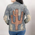 Bring the desert spirit to your wardrobe with this standout acid-wash denim jacket, detailed with a large hand-tooled cactus motif in rich floral leatherwork. Inspired by Western landscapes and cowgirl grit, this jacket is a bold blend of tradition and edge. Crafted with character and made to last, it’s the perfect layer for rodeos, festivals, or everyday statement style.